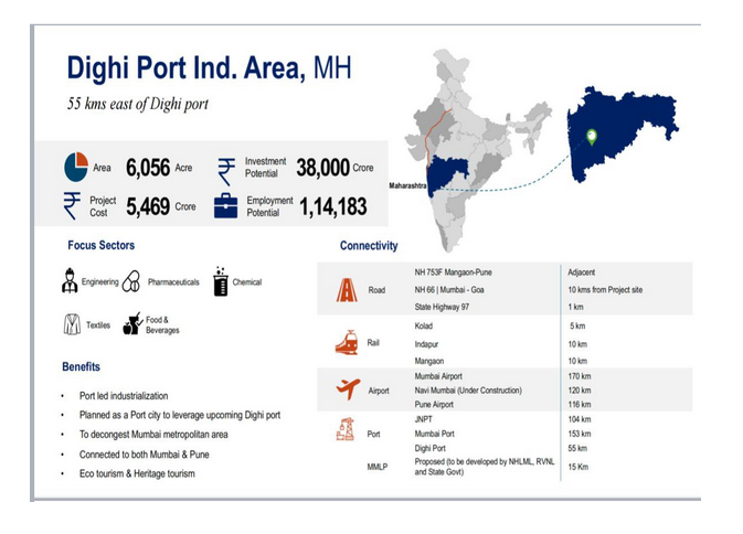 1. प्रस्तावित शहर दिघी बंदराच्या पूर्वेला 55 किमी अंतरावर 6,056 एकरमध्ये पसरले आहे, ज्याची किंमत 5,469 कोटी रुपये आहे.