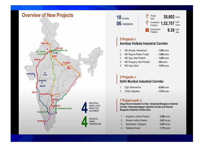 देशाची आर्थिक वाढ आणि जागतिक स्पर्धात्मक जगातील आव्हानांचा सामना करण्यासाठी प्रयत्न करण्यासाठी चालना देण्याच्या उद्देशाने 10 राज्यांमध्ये पसरलेल्या आणि 6 प्रमुख कॉरिडॉरसह विविध स्तरावर धोरणात्मकरित्या नियोजन केले आहे. 12 औद्योगिक स्मार्ट शहरांचे उद्दिष्ट देशाच्या औद्योगिक लँडस्केपमध्ये बदल घडवून आणण्याचे आहे, ज्यामुळे औद्योगिक नोड्स आणि शहरांचे एक मजबूत जाळे तयार केले जाईल.